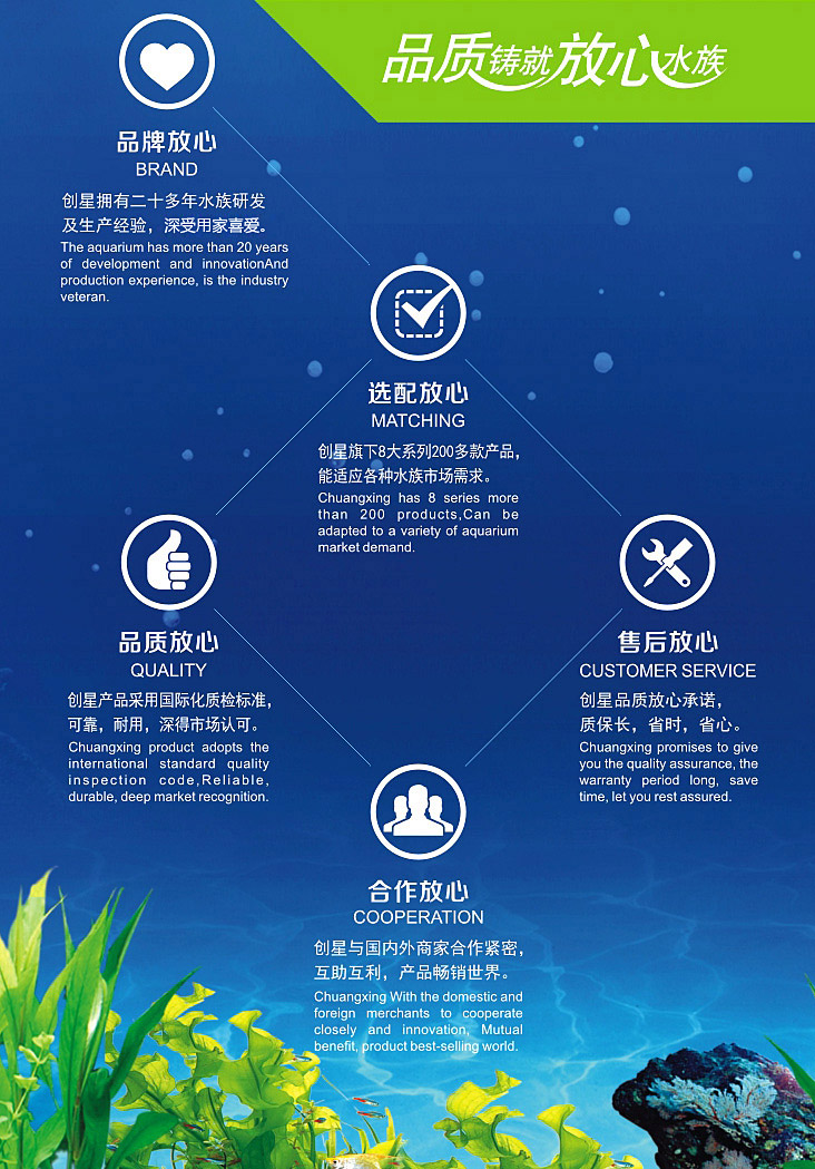為讓市場更了解創(chuàng)星核心價值觀,我們重塑了新的廣告語:“品質鑄就放心水族”。